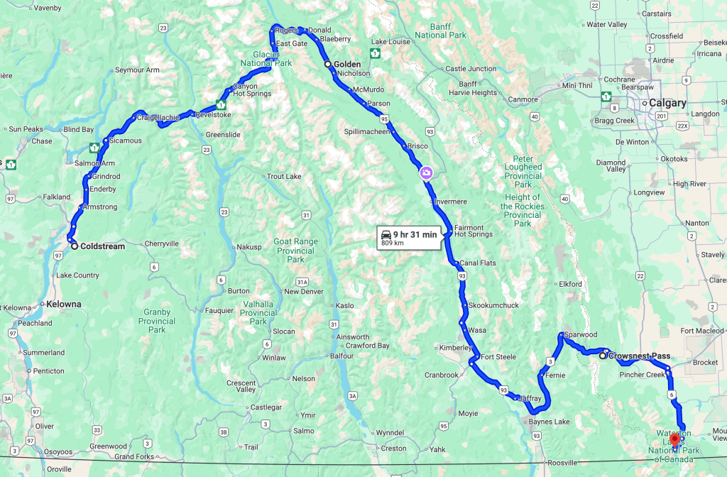 Quite a long drive mostly south on the now usual excellent roads. More mountains and lakes through Crowsnest Pass, almost to the US border. As we got closer to Waterton, we were in the foothills of the Rocky Mountains in Alberta, with the country opening up for the first time since we left Vancouver.